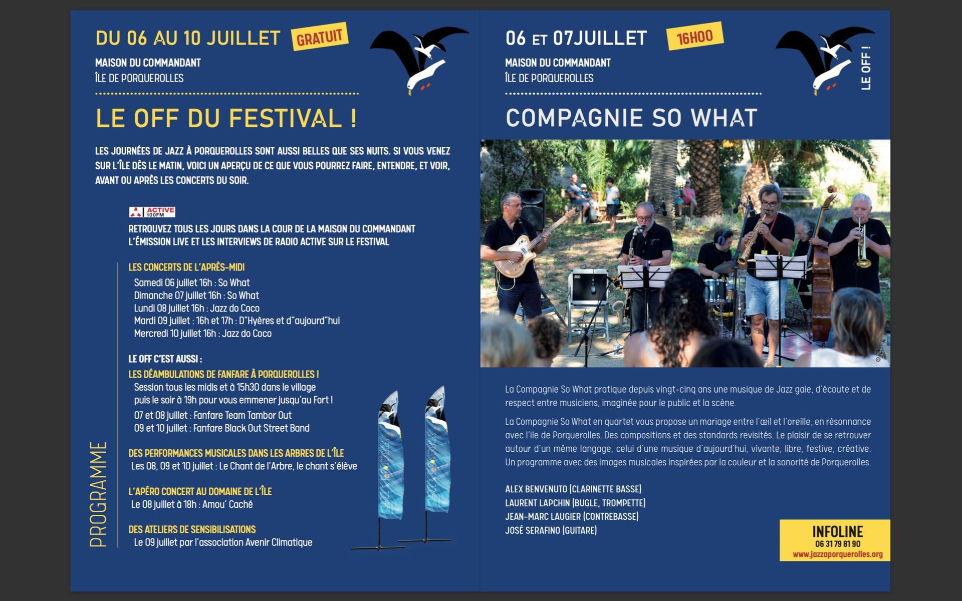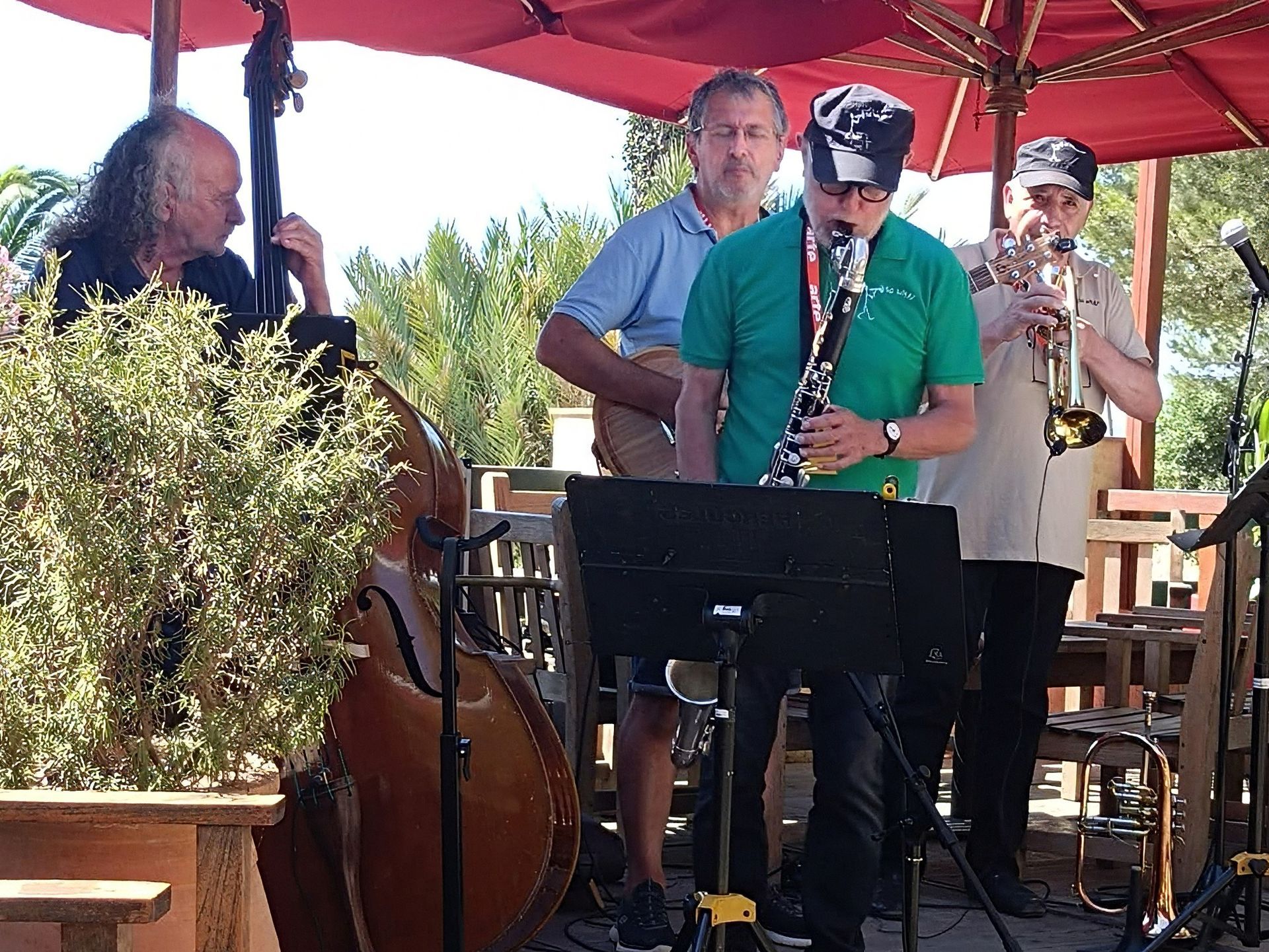 Les élections législatives ont quelque peu perturbé le déroulement des concerts du "off" cette année à Porquerolles : la "Maison du Commandant" devait en effet les accueillir dans ses jardins mais le bâtiment avait été fermé pour installation d'un bureau de vote... Le samedi 6, le concert de la Compagnie So What s'y est tout de même déroulé, mais sans chaises pour le public. Le lendemain, nous avons été aimablement accueillis par la terrasse du restaurant "Côté Port", dans des bien meilleures conditions. Quoi qu'il en soit, c'est avec grand plaisir que le quartet a déroulé ses thèmes, dont le "Guy Dance" du batteur Aldo Romano, figure emblématique du festival. Un grand merci aux organisateurs et aux bénévoles qui ont dû jongler avec les circonstances !