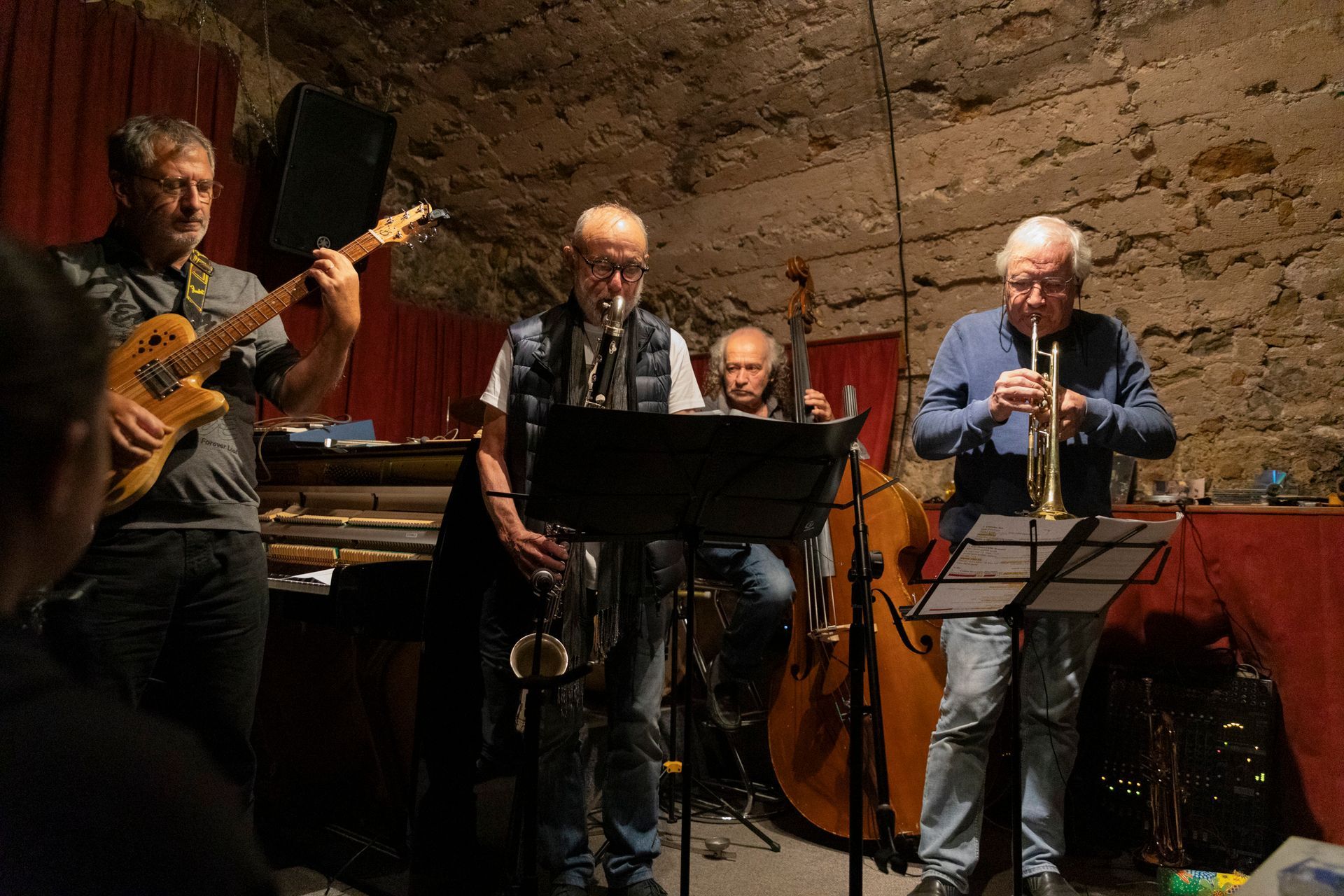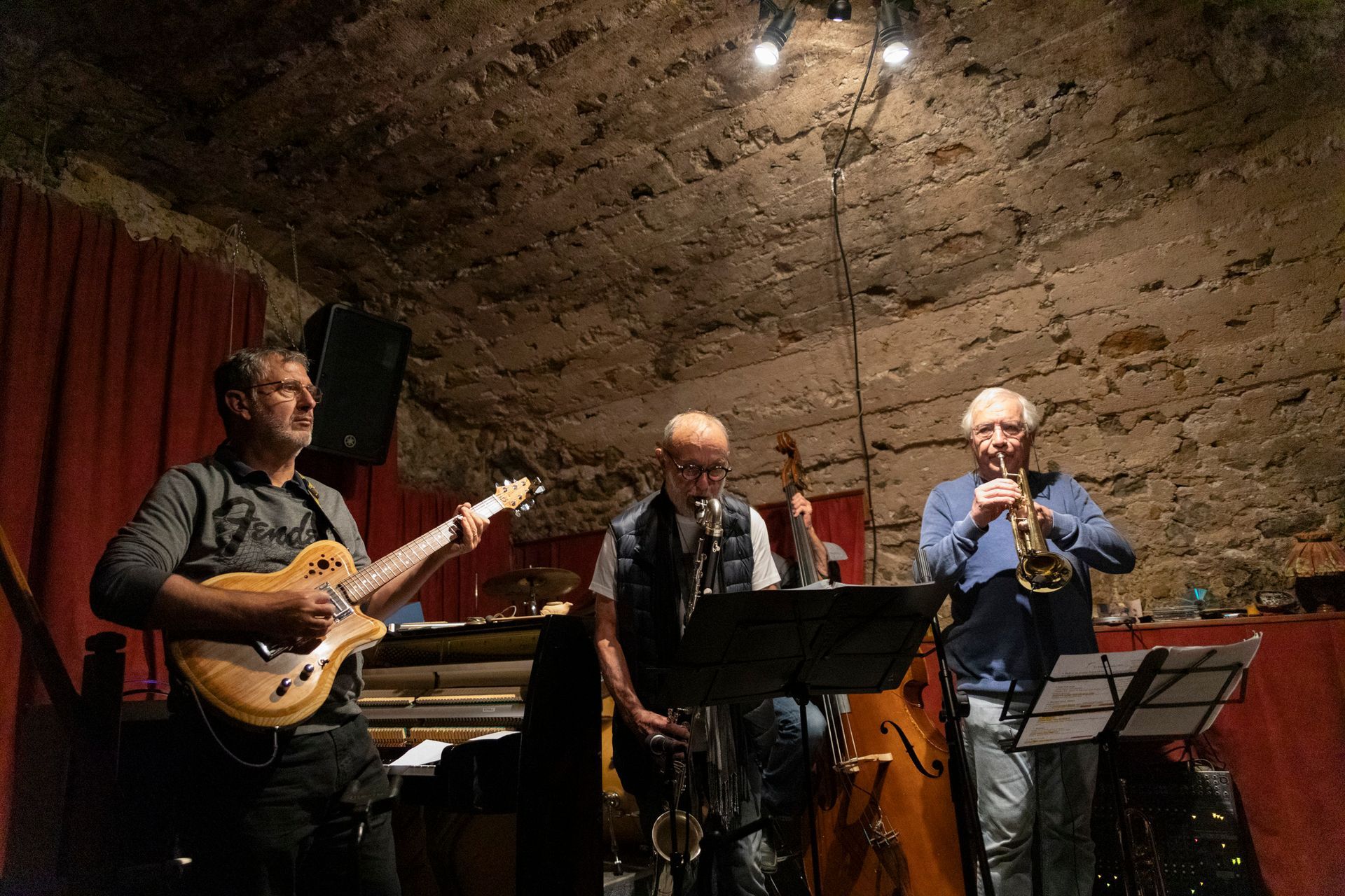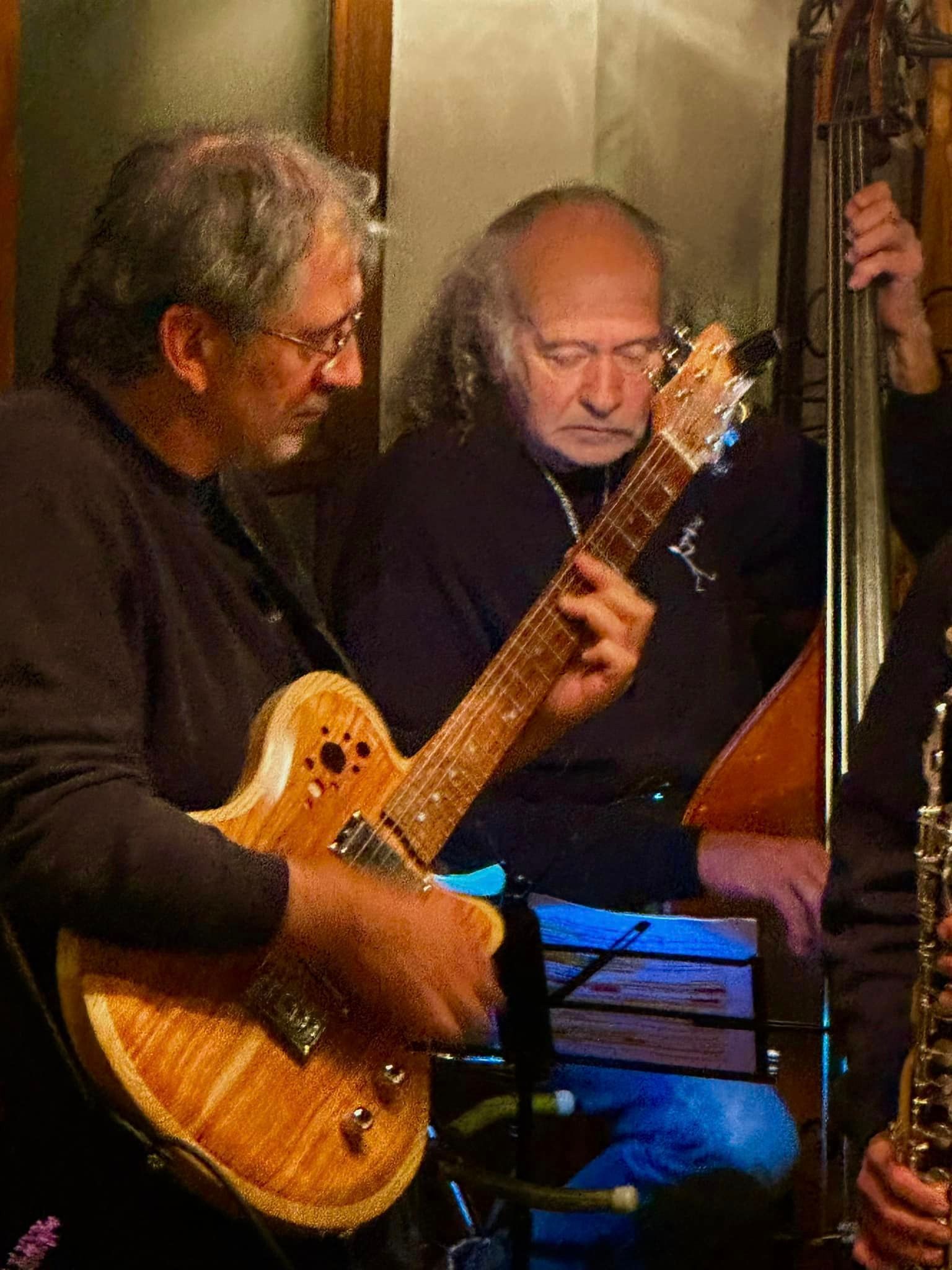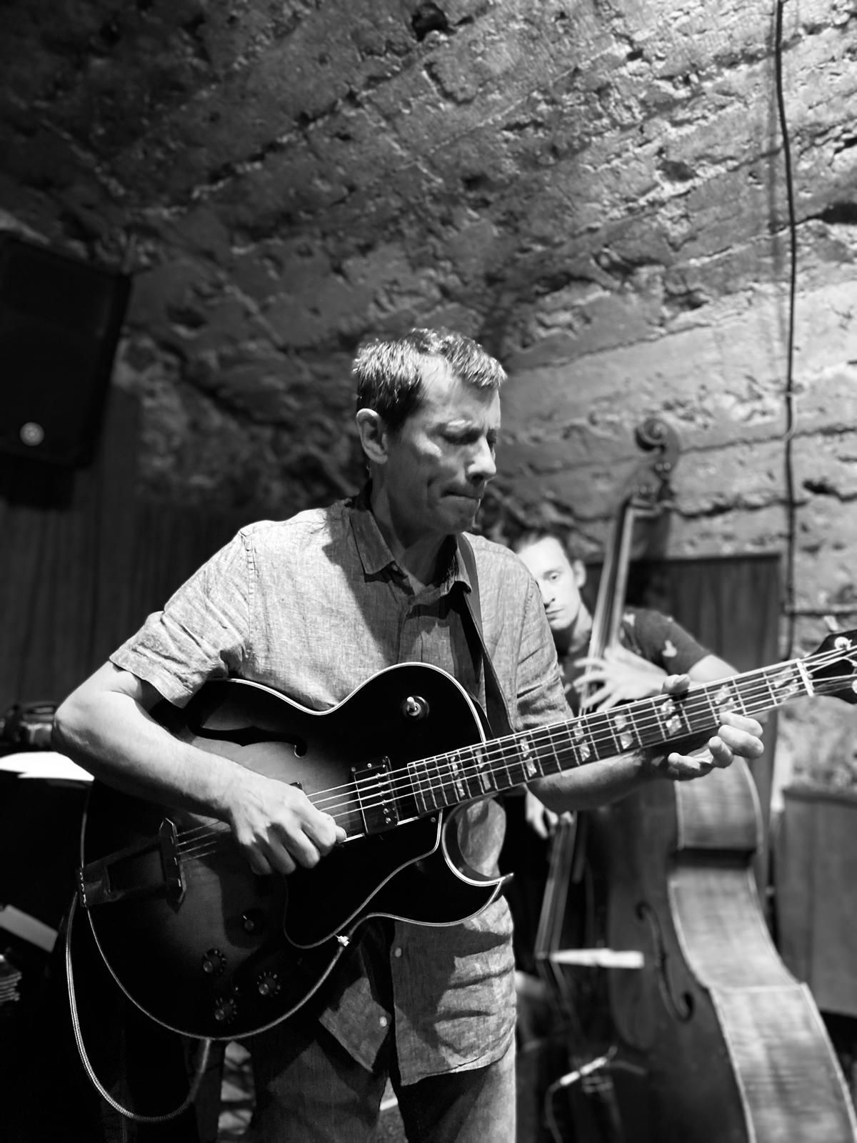 En deuxième partie de soirée, nous avons reçu pour la première fois le grand guitariste Pierre Bertrand, accompagné du jeune et talentueux contrebassiste Clément Douziech, lui aussi nouveau venu, et d'un habitué des lieux, l'excellent batteur Jérôme Achat. Un répertoire riche, des interprétations intenses et émouvantes, comme cette adaptation très personnelle et très réussie du célèbre Wonderful World d'Armstrong. Et pour terminer cette belle session, Franck Taschini a rejoint le trio pour le bonheur de tous.