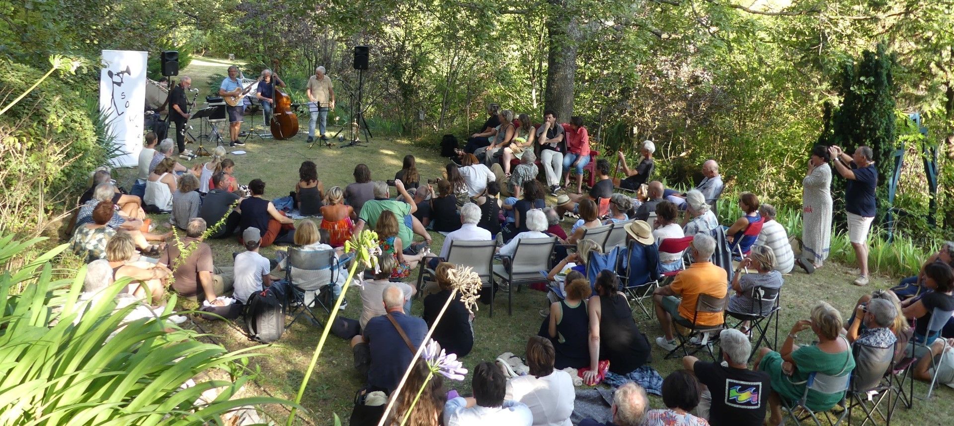 La foule des grands jours était présente pour ce concert champêtre, dans ce lieu magique, où la musique semble se fondre parmi les essences rares ou communes qui peuplent les méandres des chemins et les espaces qui appellent au repos ou à la méditation. Les musiciens comme le public sont en osmose avec l'endroit... Musiciens et public, en osmose, ont profité de l'instant, avant de déguster pissaladière et pizza de Xavier le boulanger autour du verre de l'amitié. Des moments comme on les aime !